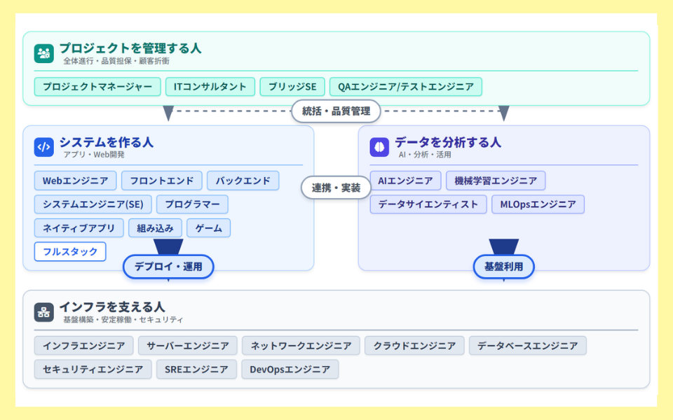 ITエンジニアには25種類以上の職種があり、それぞれが異なる役割を担っています。「システムを作る人」「インフラを支える人」「データを分析する人」「プロジェクトを管理する人」など、担当する領域は多岐にわたります。これらの職種は独立しているわけではなく、互いに連携しながら一つのシステムを作り上げていきます