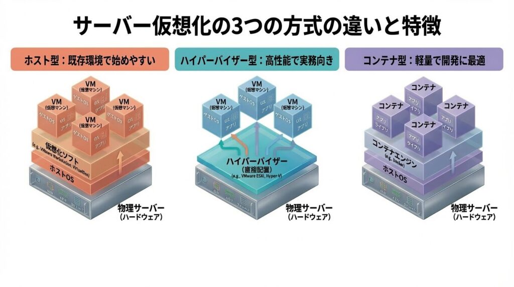 サーバー仮想化には大きく分けて3つの方式があり、目的や使う場面によって適した選択が変わります。基礎を押さえておくことで、学習や実務・クラウド利用の場面でも判断しやすくなるとともに、性能不足や運用のしづらさを回避できるようになるはずです。