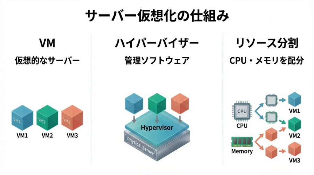 仮想マシン(VM)は、物理サーバー上に作成される仮想的なサーバーのことです。実際のハードウェアを仮想化して、まるで独立したサーバーであるかのように動作します。