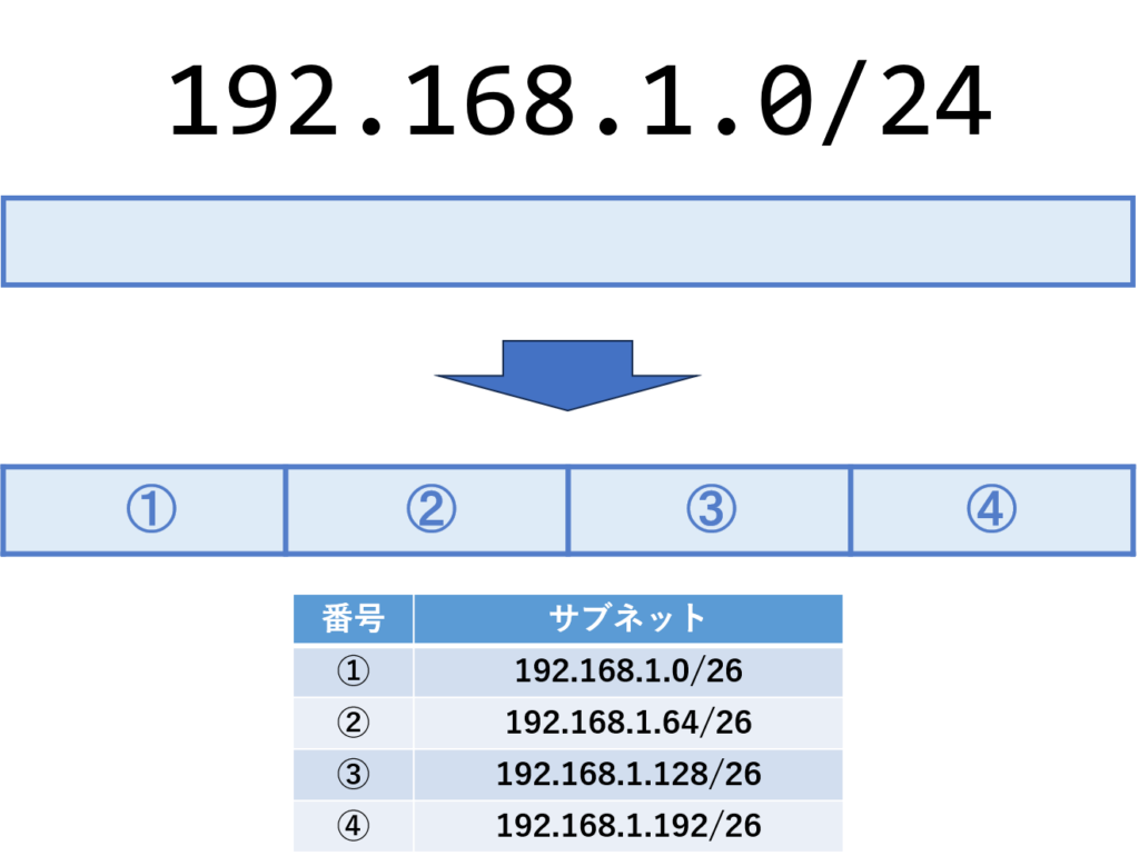 /26のサブネットは、1つのネットワークをさらに小さく分割するときに使われる設定です。/24のネットワークをそのまま使うと、254台の機器を接続できますが、実際にはそこまで多くの機器が必要ない場合もあります。そのようなときに、ネットワークを複数の小さなサブネットに分割するのです。