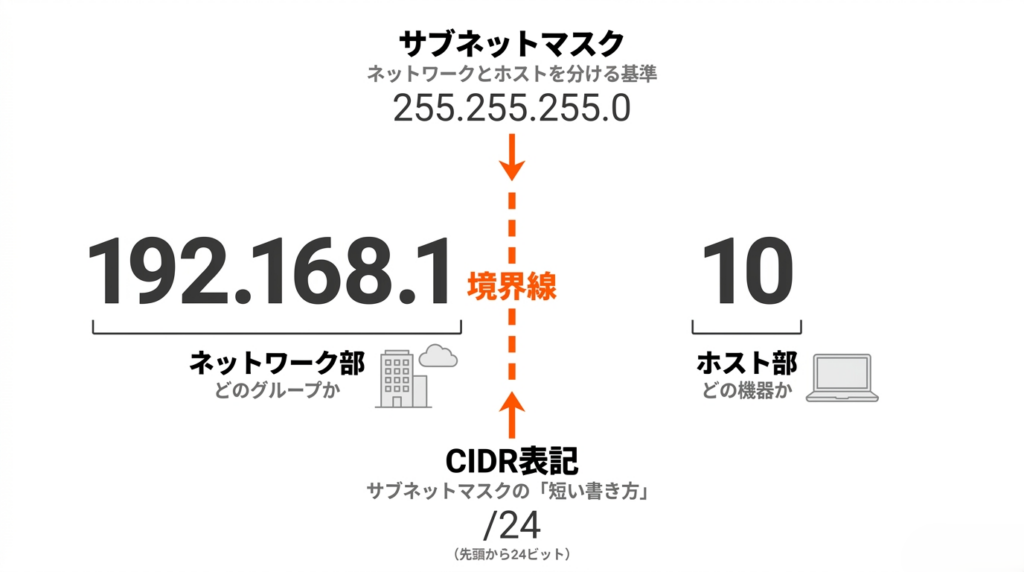IPアドレス「192.168.1.10」とサブネットマスク「255.255.255.0」が設定されている場合、ネットワーク部は「192.168.1」の部分になります。サブネットマスクは境界を示すための情報であり、ネットワークそのものを意味する言葉ではありません。この違いを整理しておくことが、サブネットを理解するための基本です。