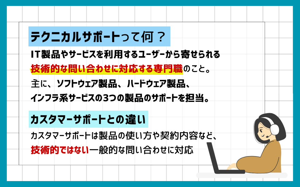 カスタマーサポートは、製品の使い方や契約内容など、技術的ではない一般的な問い合わせに対応する窓口です。一方、テクニカルサポートは技術的な問題解決がメインミッションです。ネットワークやサーバー、データベースといったインフラ系の知識が求められ、その分、専門性が高くエンジニア職へのキャリアパスも開けやすい職種といえます。