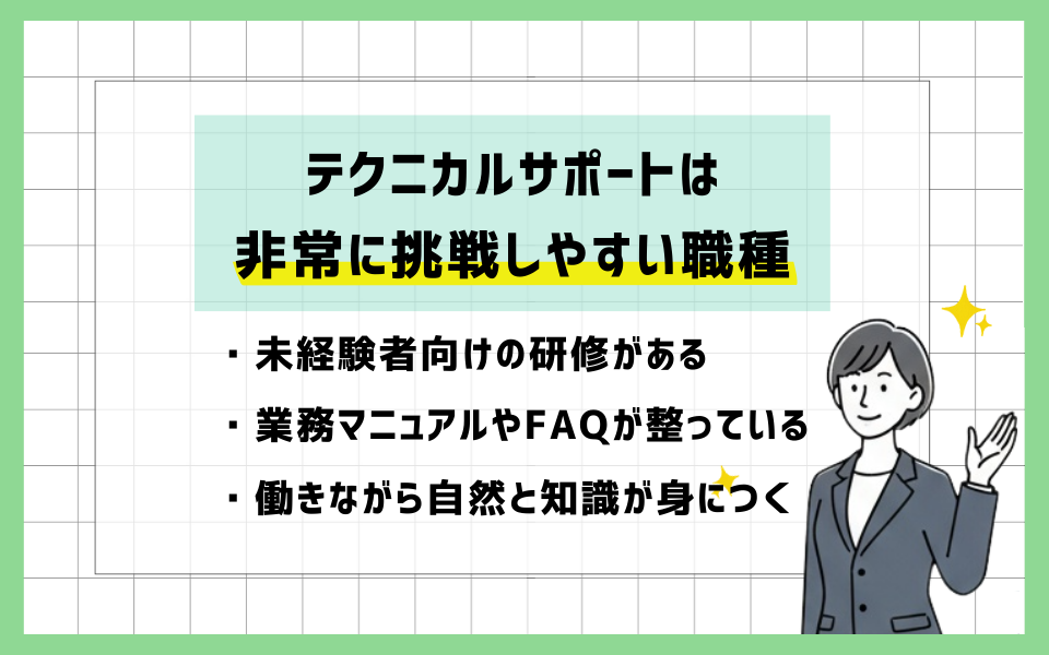 テクニカルサポートで最も重視されるのは、技術力よりも「相手の話を丁寧に聞く力」と「わかりやすく説明する力」です。営業職や接客業、販売職などで培ったコミュニケーション能力は、そのまま武器になります。
