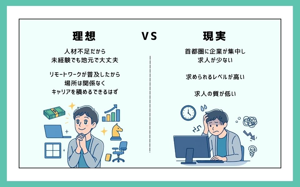 地方でエンジニア転職を検討中のあなたが直面する最も大きな課題は、「理想と現実のギャップ」です。「IT人材不足だから地方でも未経験で転職できるはず」「リモートワークが普及したから場所は関係ない」といった期待を抱いているかもしれませんが、実際の転職市場は想像以上に厳しい現実があります。
