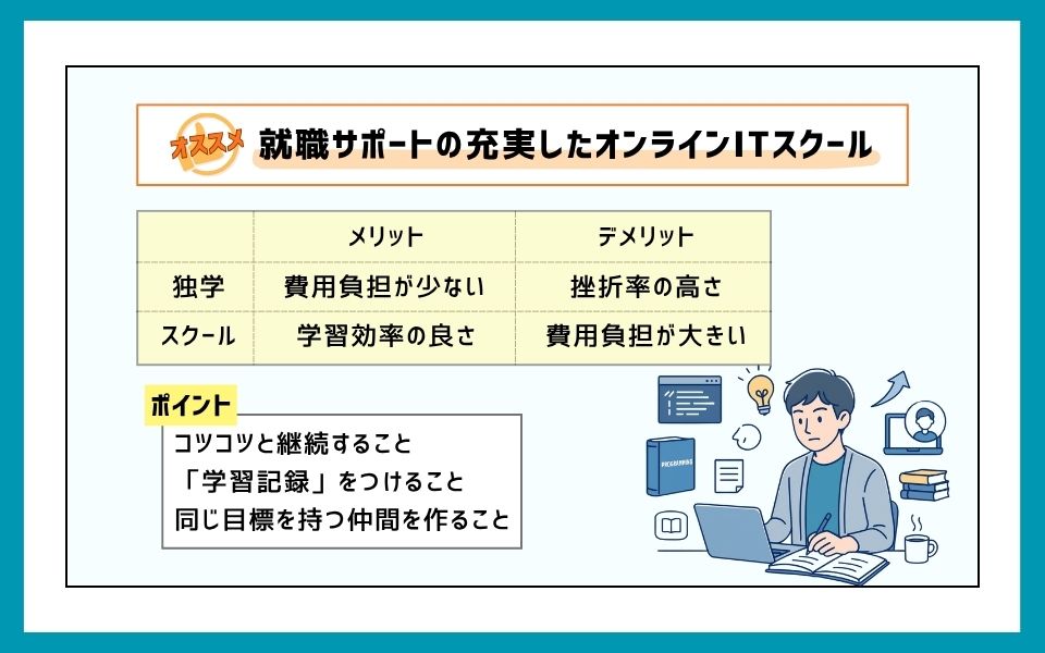 一方、オンラインスクールのメリットは学習効率の良さです。独学で1年かかる内容を、スクールなら3-6ヶ月で習得できることが多く、結果的に転職までの期間を大幅に短縮できます。特に地方では求人の競争が激しいため、早期にスキルを身につけて転職活動を始めることが重要です。