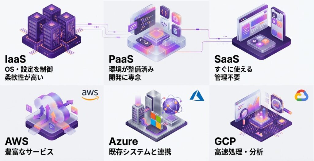 現在よく使われているクラウドには、代表的な3つのサービスがあります。それぞれ考え方や得意分野が異なり、すべてを完璧に覚える必要はありませんが、基本的な違いを知っておくと理解を深められるでしょう。