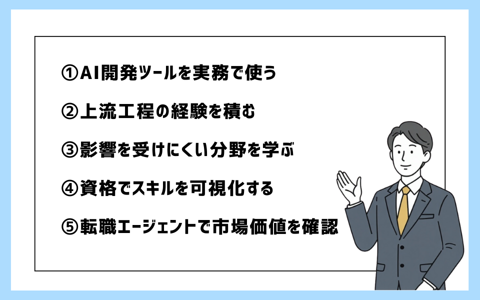 前章で「AI時代に評価されるエンジニアの特徴」を見てきましたが、「では、具体的に何をすればいいの?」という疑問をお持ちでしょう。この章では、今日から実践できる5つの具体的な対策をご紹介します。