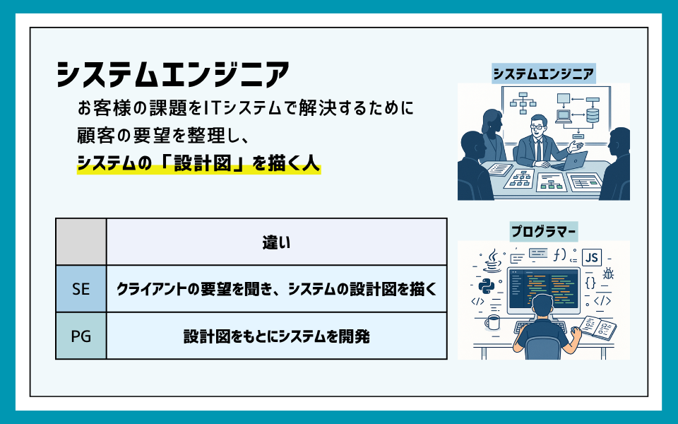 システムエンジニア(SE)とプログラマー(PG)はよく混同されますが、役割が異なります。簡単に言うと、SEが「システムの設計図を描く建築家」であるのに対し、PGは「設計図をもとに家を建てる大工」です。SEが作成した設計書がなければ、PGはプログラムを作ることができません。一方で、SEもプログラミングの知識がなければ、実現不可能な設計をしてしまう可能性があります。両者は密接に連携しながら、一つのシステムを作り上げていく関係です。