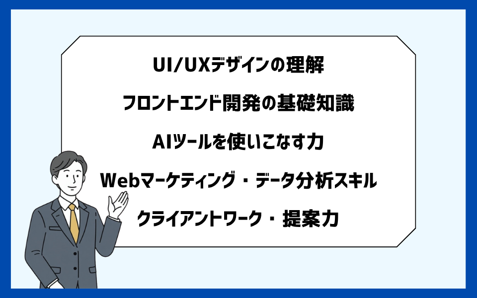 AIに代替されず、企業から「この人なら採用したい」と思われるWebデザイナーになるためには、どんなスキルが必要なのでしょうか。転職エージェントとして企業の採用担当者から実際に聞いた声をもとに、必須の5つのスキルを解説します。
