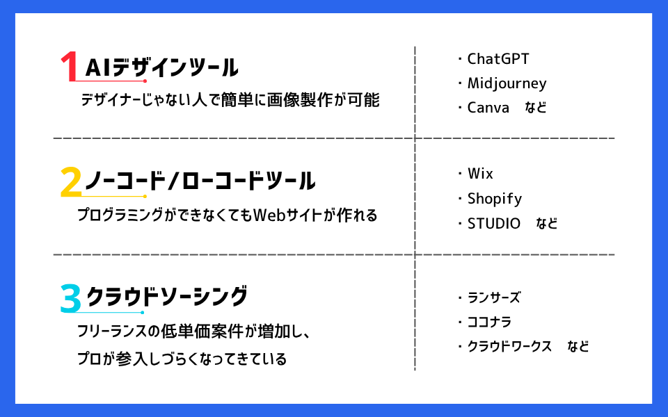 なぜ「Webデザイナーの仕事がなくなる」と言われるのでしょうか。主な理由は3つあります。