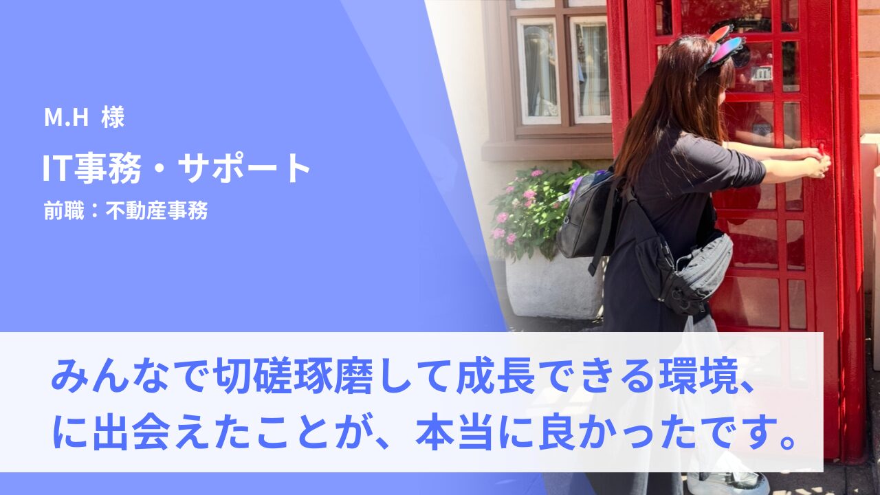 「手に職をつけて、今後長く働ける環境を作りたい」という思いから、将来的にも需要の高いIT業界に興味を持ちました。前職では事務職としてデータ入力や電話対応を中心に行っていましたが、このまま同じ業務を続けていくことに限界を感じていました。今後のキャリアを考えたとき、もっと専門的な知識を身につけられる環境に身を置きたいと考えたことが、転職を決意したきっかけです。